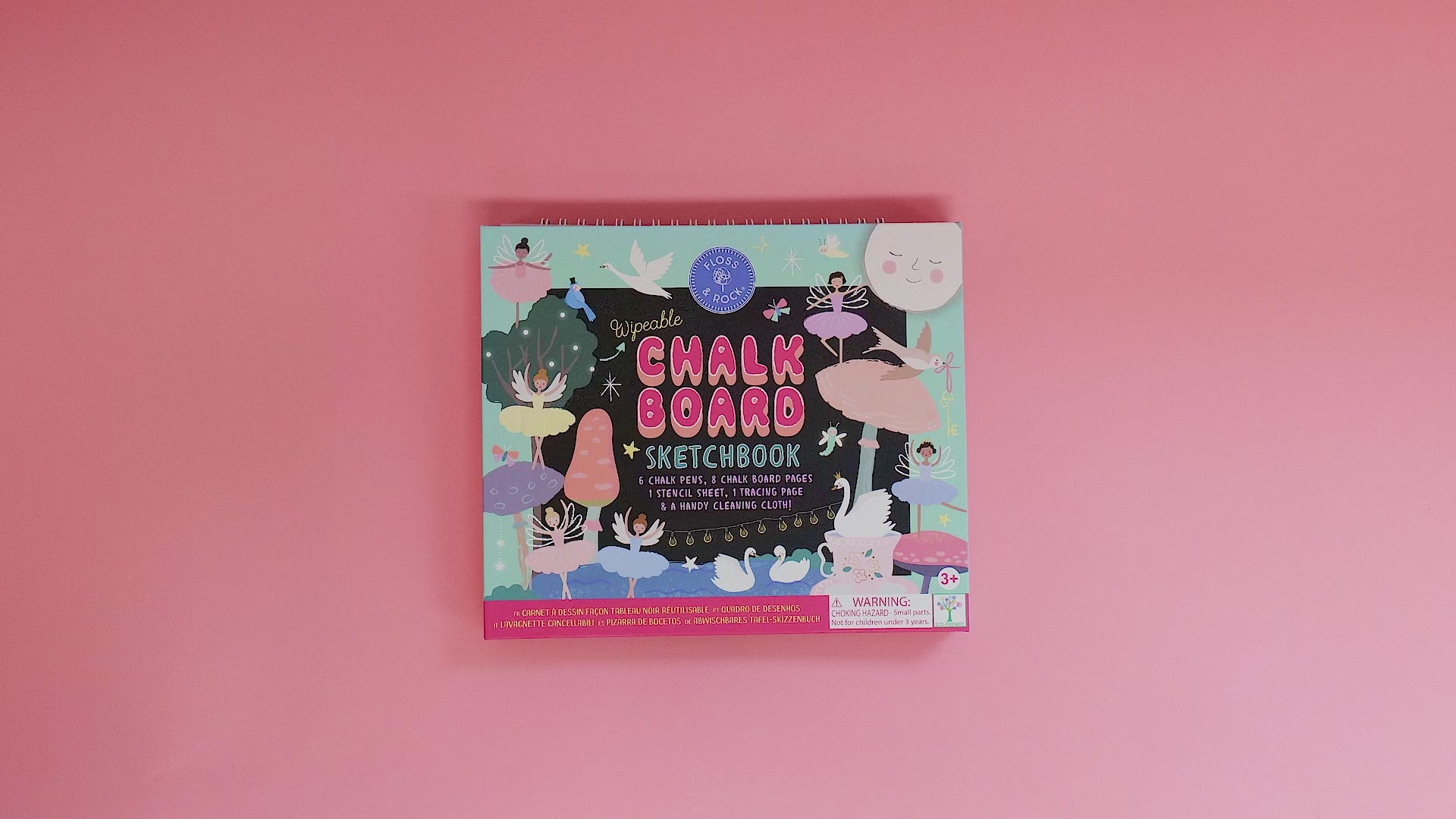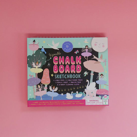 Chalk board fun in a wipeable sketchbook format! This brilliant Enchanted Chalk Board Sketchbook contains 8 pages. 5 pages with ready to colour-in illustrations featuring our lovely ballet dancers, woodland creature friends and more, plus 3 plain pages ready for freestyle doodling! There's also a tracing sheet and a super, Enchanted themed stencil sheet. Both these sheets can be removed and clipped into the spiral book bind where ever you choose! The sketchbook comes with 6 coloured chalk pens and a handy cleaning cloth to wipe the pages clean when you're finished, ready to start again and continue with your creativity next time! The pages are printed with vegetable inks and all of the paper, card, plastic and metal contents are recyclable.
