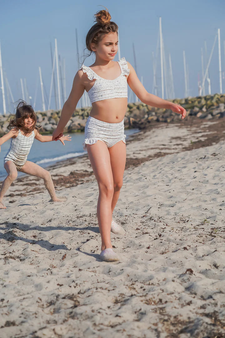 With cinched and ruffle details, the GRECH & CO. High Waist Bikini shares vintage notes of Summers past. Featuring ribboned straps and a ribbon lined bottom, all the details of this bikini add the perfect amount of sunkissed summer sweetness.